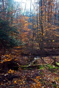 The sun trickles though the woods, as does Roberts Run, on a cold November morning.  Although it is mid-November, there is still color in the NW Pennsylvania forests.  The Beech trees always seem to be the last to lose their leaves, some ferns still green, and the native hemlock is always a stately green.